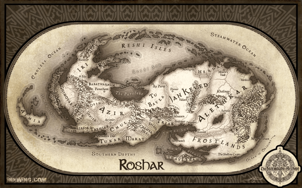 Roshar is in a solar system and world alien to our own. In this solar system, the Cosmere, each planet receives a different magic system related directly to the Shard or Shards located on that planet. Shards are fragments of Divine Command, each taking on an aspect of the universe, like Honor, Passion, or Cultivation. In fact, those are the three Shards located on Roshar. The person who possesses the Shard becomes a god, more akin to a Greek god, with whims and personality and faults but also incredible power. Sanderson has a half-dozen different book series, each taking place on a different planet in the Cosmere. The Stormlight Archive takes place on Roshar.