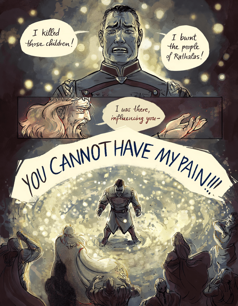 Dalinar, confronted by the Thrill, the Unmade spren of Odium that has corrupted the hearts of Alethi and others for millennia, the Thrill that in his anger was at least partially responsible for killing his wife and for all of the killing he did, or at least for driving him on, almost gives in it. Then Odium, the Shard of Passion, whose final weapon to drove others to his side is to take their emotion, to take their pain away so they are captive only to him, tells Dalinar to give him his pain. And for a moment, you are so worried that it’s going to happen. That then Dalinar will become Odium’s champion to defeat the world of humans.